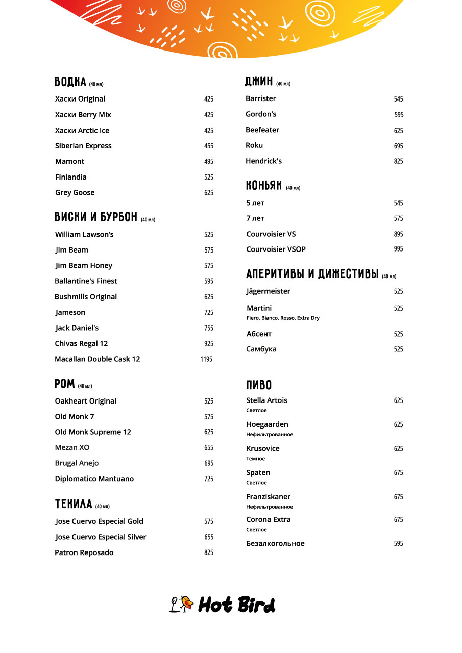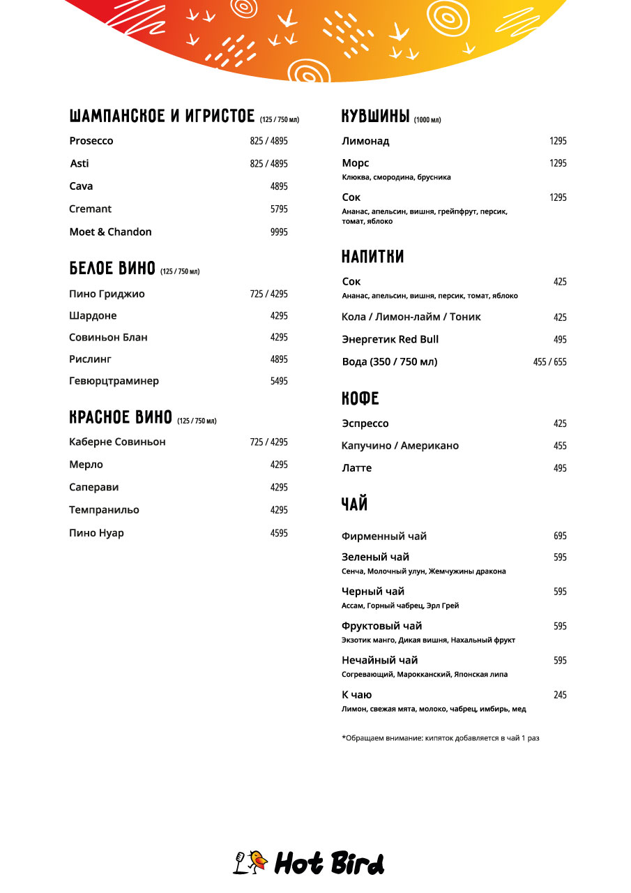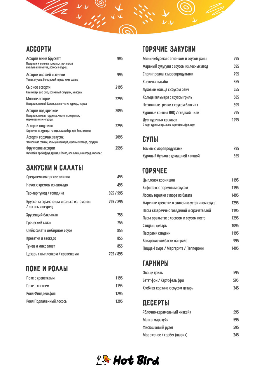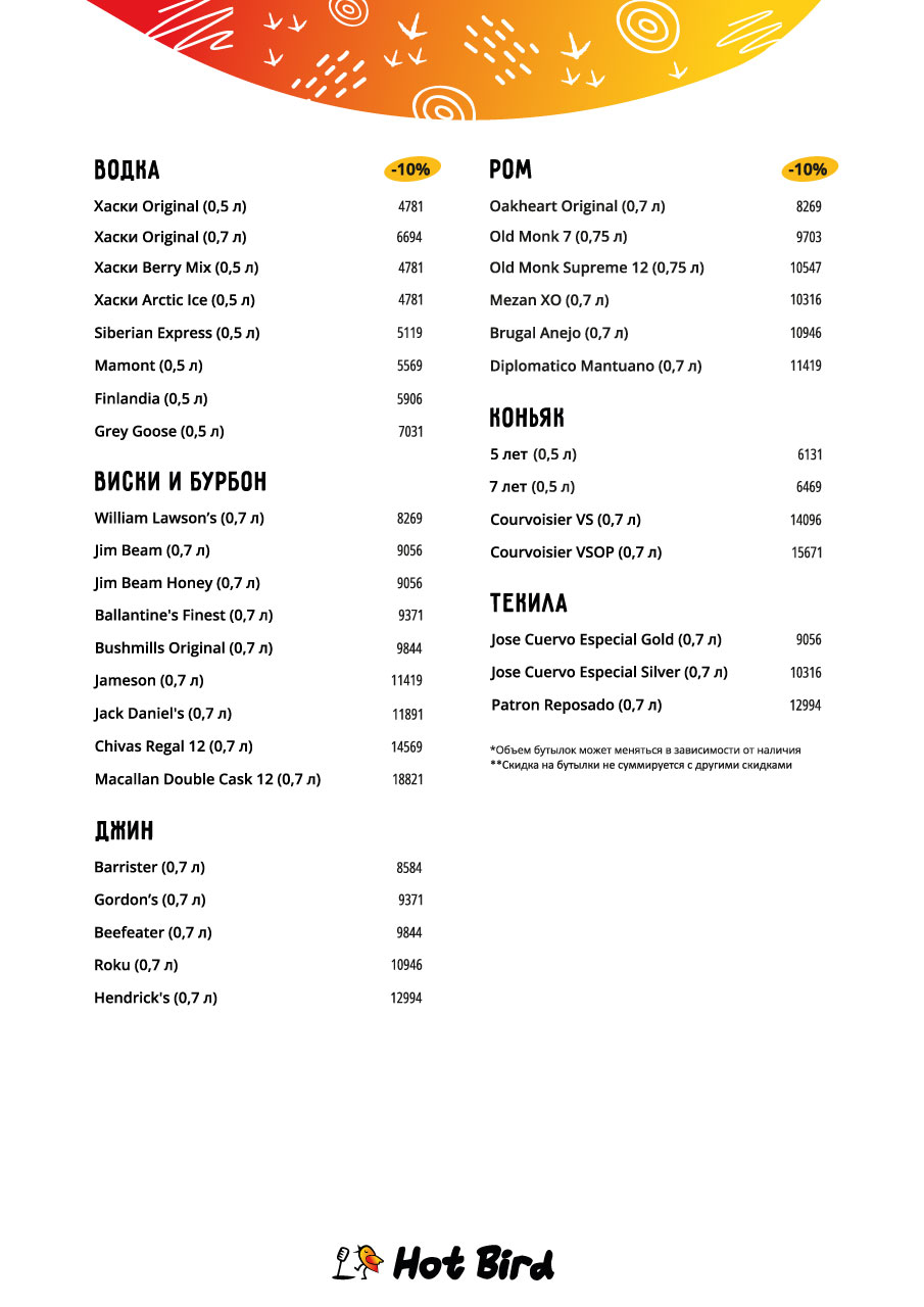 Меню кухни и бараВ меню кухни и бара Hot Bird представлены тщательно отобранные блюда и напитки по невысоким для центра Москвы ценам. Ведь натощак и песня не поется, да и песня веселее допевается, когда коктейль до конца допивается. Акции и скидки караоке бара Hot BirdКоманда Hot Bird любит и ценит каждого Гостя, поэтому мы готовы постоянно радовать Вас свежими предложениями и разнообразными акциями! У нас есть акции, которыми Вы можете воспользоваться каждый день, и весомая скидка на День рождения! Для Вас есть следующие спецпредложения: